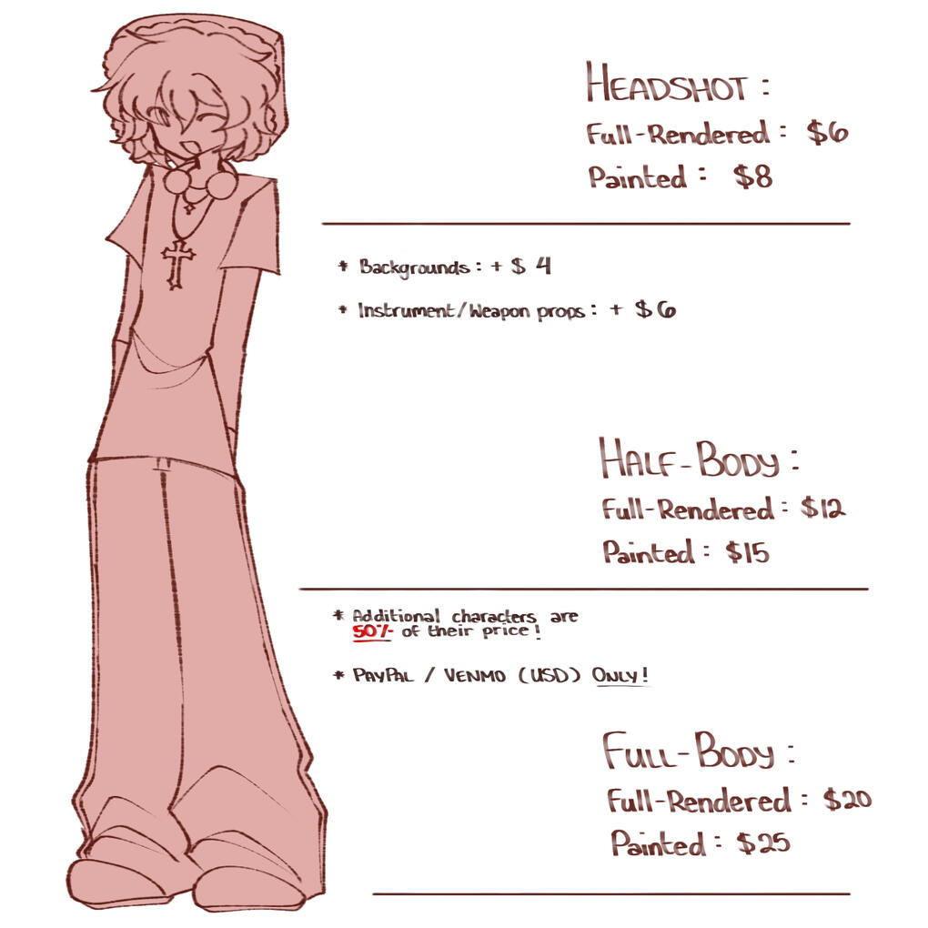 I have the right to refuse a commission for any reason not specified!I take payment (USD) upfront through PayPal and Venmo only! There are no refunds nor can other prices/payment methods be negotiated!One commission will take 1-2 weeks to complete. Though, I will be as communicative as possible with you during the process of completion!My style fluctuates! If there’s any specific artstyle you want me to replicate, let me know!